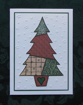 I embossed a piece of white pearlescent card using my Crafts-Too 'Twinkle' stars folder and then layered this onto a scrap of dark green card and then onto a pearlescent white card blank. I stamped the Christmas tree onto white card and cut around the shape. I stamped the tree onto various snippets of green/red/fawn papers and attached them to the Christmas tree shape. The heart was stamped onto dark green card and attached to the pot. The Christmas tree was then attached to the front of the card. As the card has used snippets,